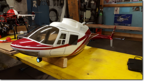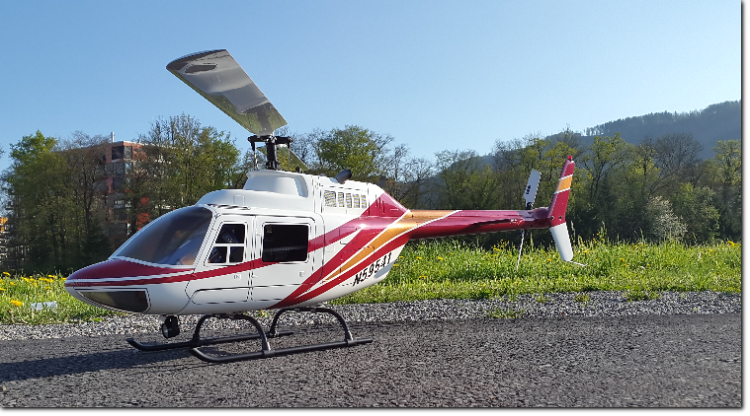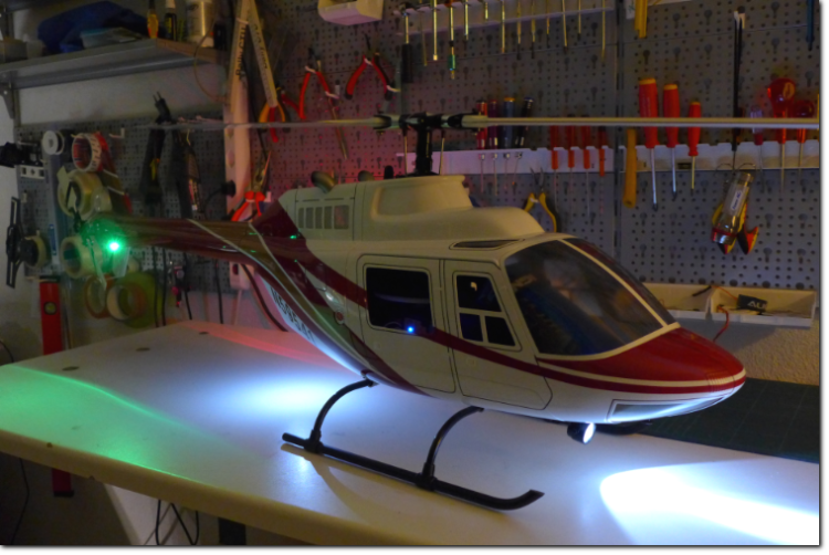 - Der Trex 550 wurde in einen Jet Ranger Rumpf eingebaut und eingeflogen. Schneiden und Schleifen hat noch Spass gemacht, obwohl die Arbeit nicht zu unterschätzen ist. Fred hat noch das Lichtset eingebaut und einen Scheinwerfer kreiert. Sieht super aus.