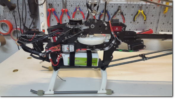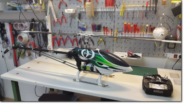 Graupner Sender MZ-24 eingestellt, Heli geprüft, Heck korrigiert, Vstabi eingestellt und eingeflogen